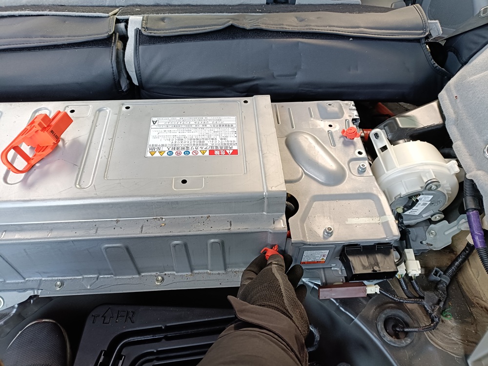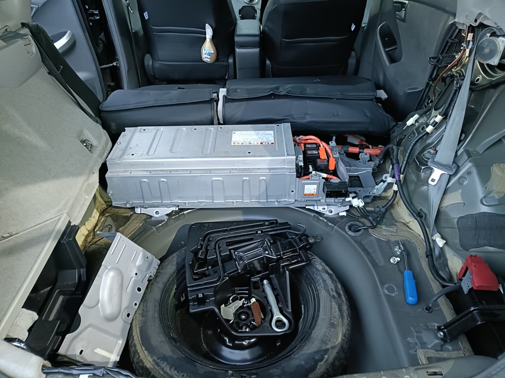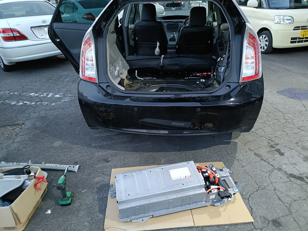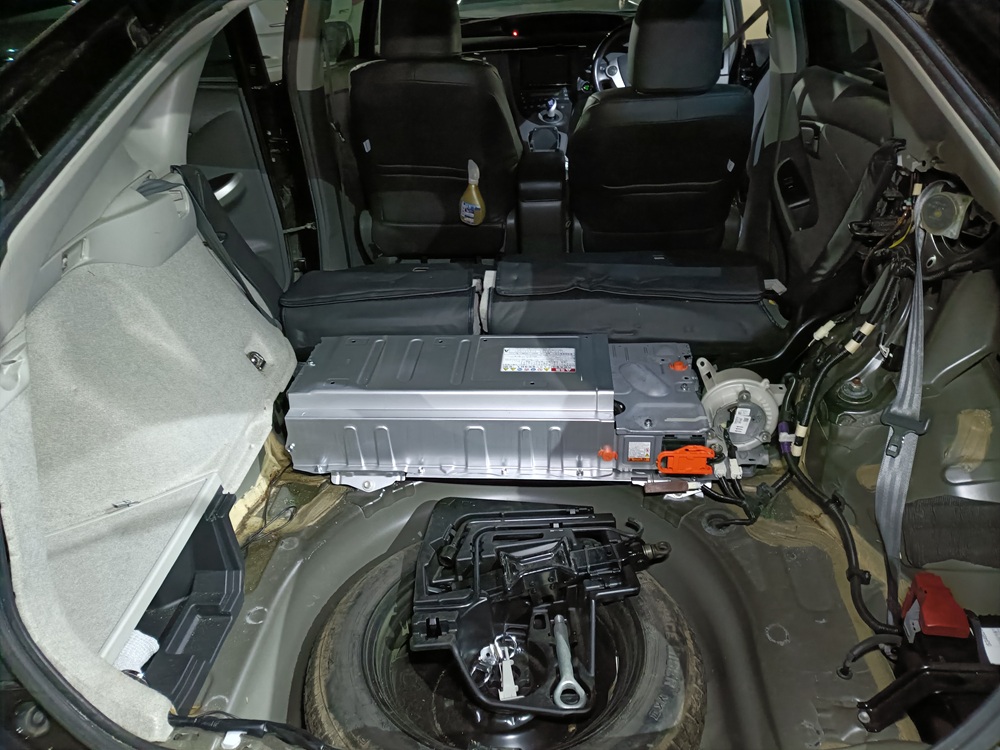 プリウスのハイブリッドバッテリーは後部座席の後ろに設置されているのでトランクからアクセスします。
