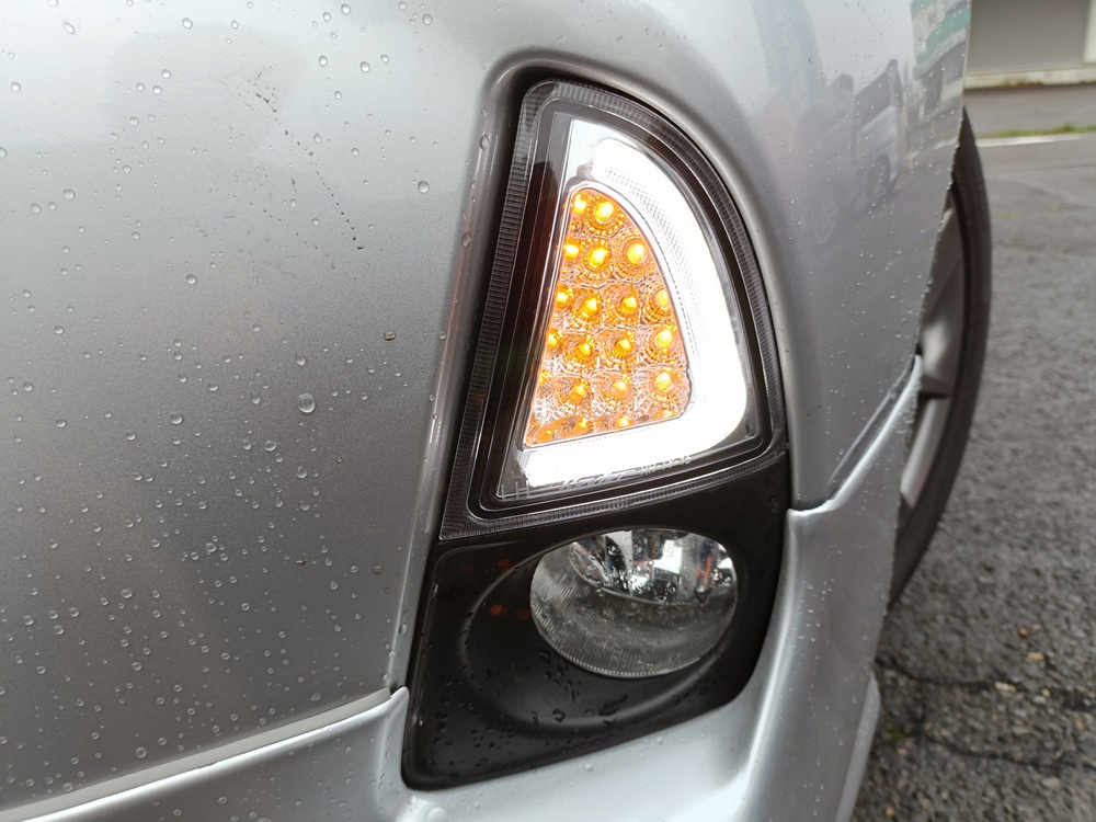 フロントバンパー内にあるウインカーレンズを社外のシーケンシャルウインカー(スモールに連動して光るライトバー付き)へ交換していきます。